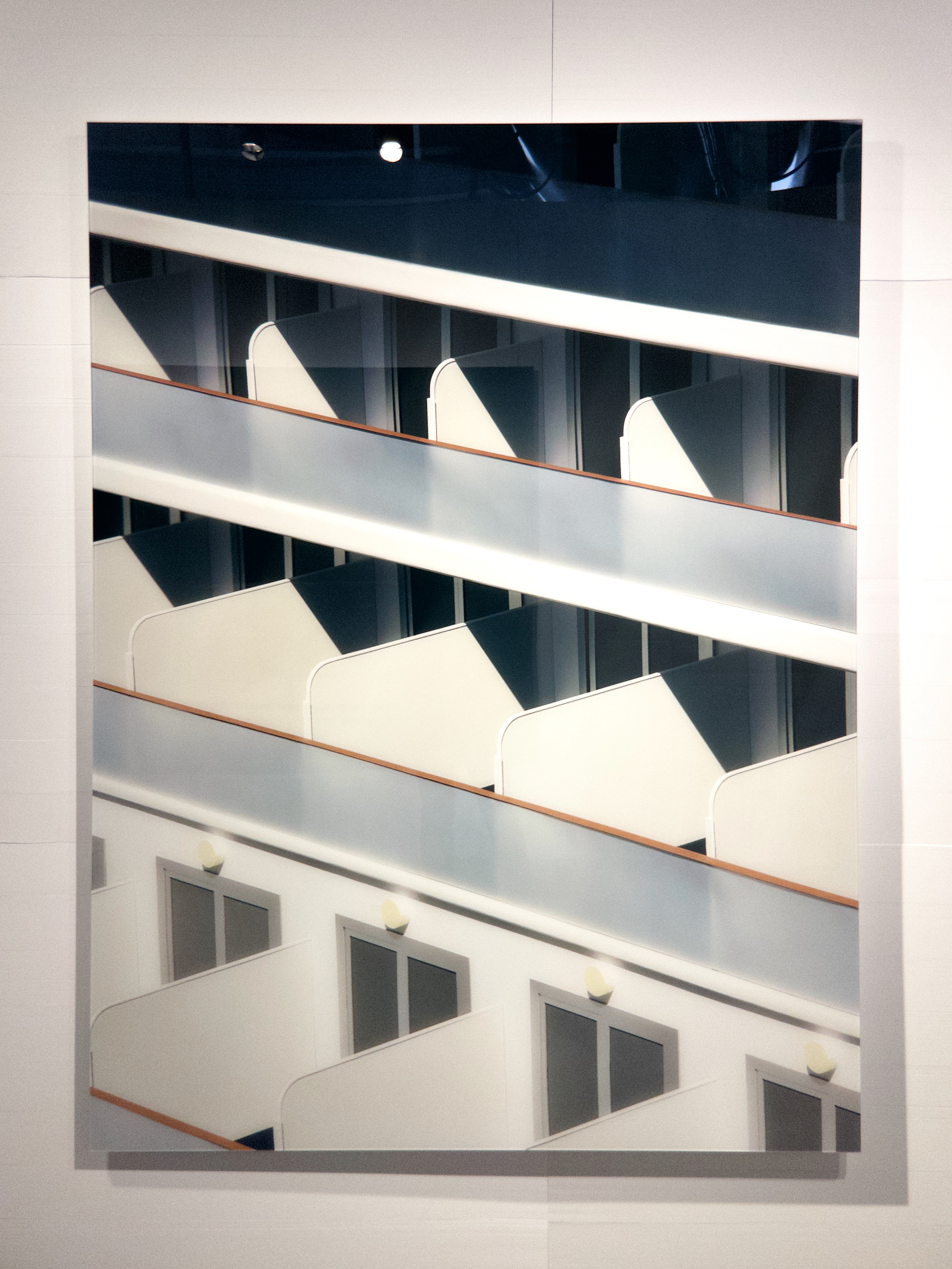 Thomas Demand是一位德国的摄影师和雕塑家,这个展览里他用纸板等各种材料重新构筑了很多非常有历史意义的照片和场景,并且使他们成为了一些新的照片。其中他再造了莫奈的睡莲,再造了991袭击之前其中一架被劫持飞机出发机场的安检点,再造了福岛核电站事故后的控制中心的照片等等,在这个莫斯科的特别展出里他还再造了斯洛登流亡莫斯科谢列梅捷沃机场里的种种景观。他的照片几乎就是我梦中想要看到的照片,安静,没有人类,有细致让人感到安慰的纹理,以及与这个世界相似又不同的色彩。我第一眼就想到了Edward Hopper以及那部翻拍他绘画的电影《雪莉:现实的愿景》。其中导演再造了Hopper十三部画作的场景,那种质感几乎和我今天看到的一模一样。最近听到的一句话让我深有感触:“艺术就是关于如何做选择”。绘画就是那个艺术家对颜色选择之后的世界。这些照片以及那部电影,视觉上就让我觉得无比舒适也可能正是因为这个原因。当然这些作品背后表达了作者的政治思想也很重要。关于展出标题无忆之镜(Mirror Without Memory)的镜子主题也许就蕴藏在这种有选择的再造之中。我这里贴一段展出里写的话: