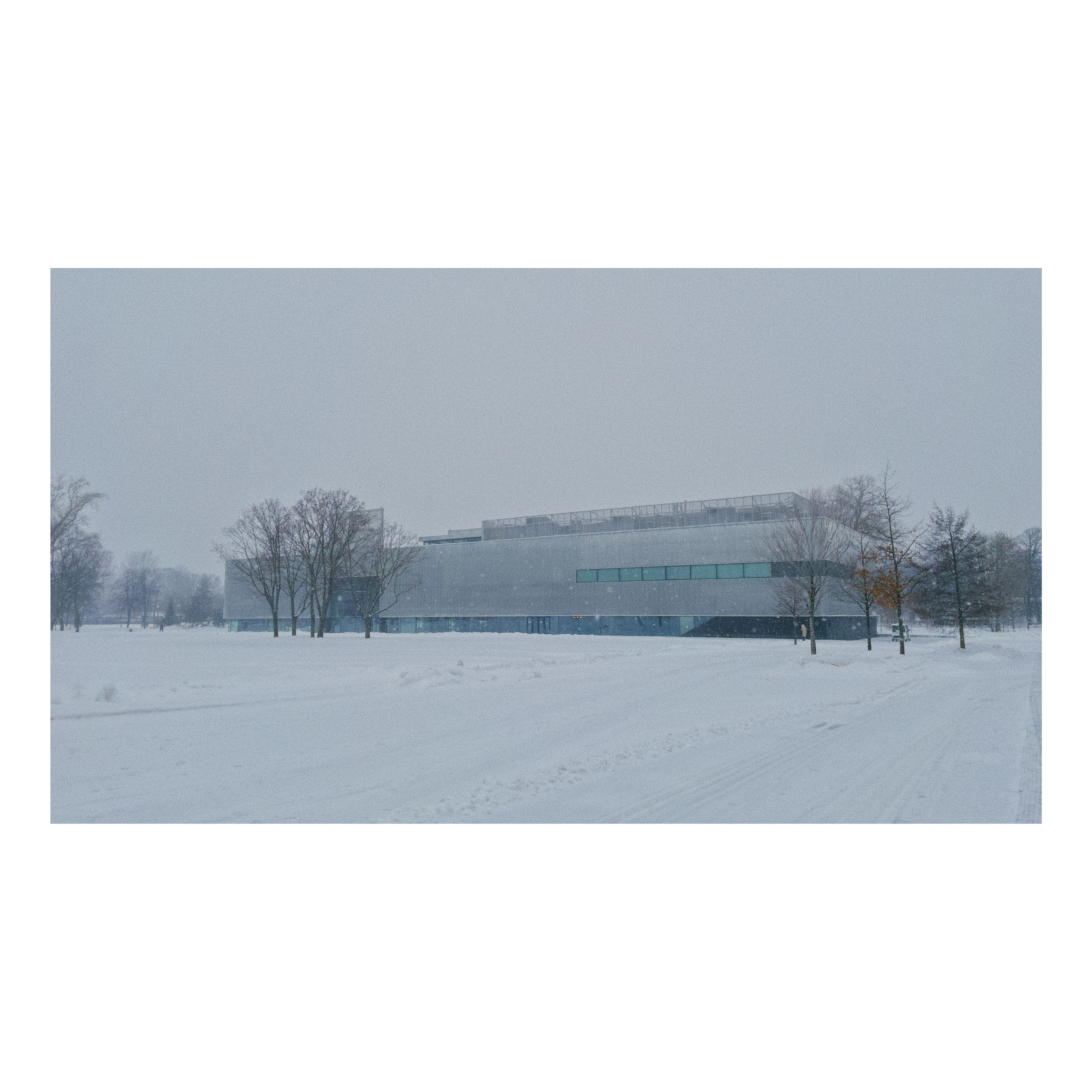 从小路出来能立马看到整个艺术馆,今天大雪纷飞,只有地平线那一排已经光秃秃的树能把大地和天空分开。